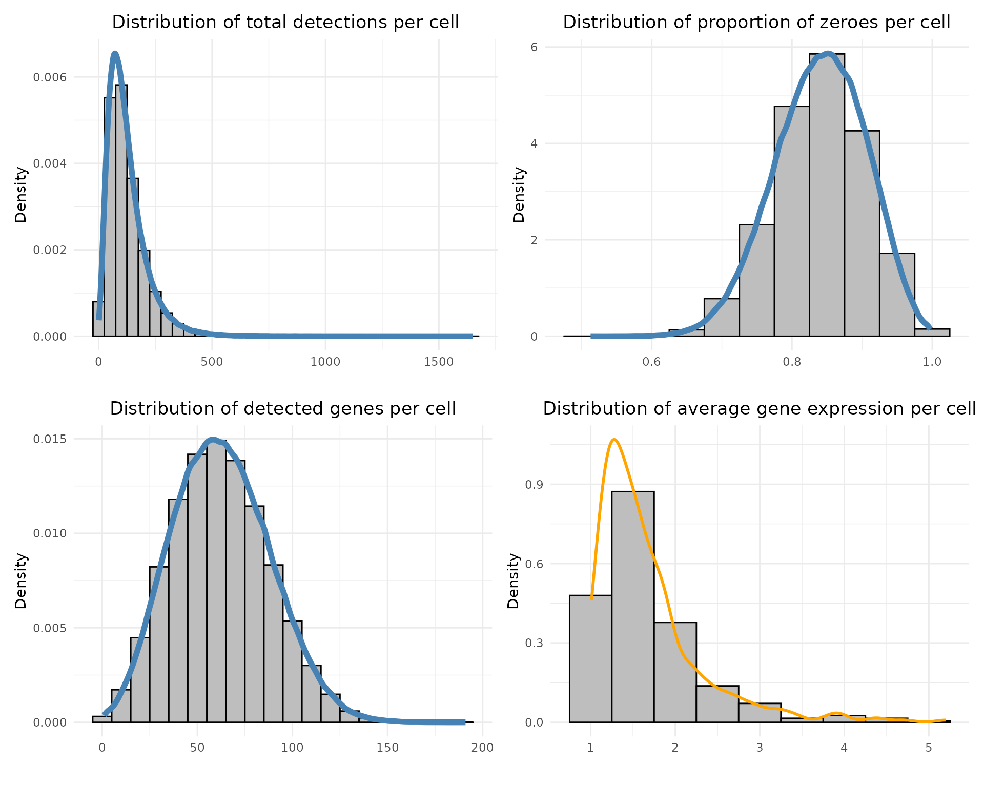 These summary plots characterise per-cell detection counts and sparsity. We can calculate per-cell and per-gene summary statistics from the counts matrix:
