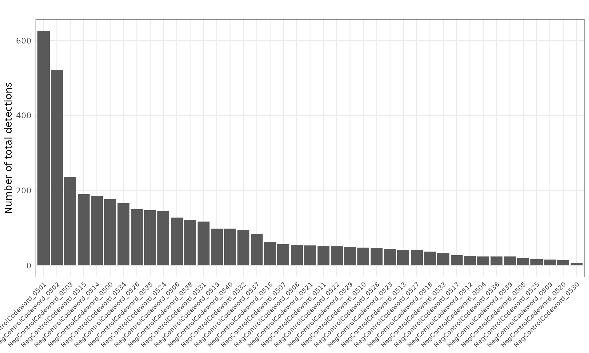 Negative control codewords are unused barcode sequences included to detect random or erroneous decoding events, providing a measure of decoding noise. We visualized both the total detection counts per target and their spatial distribution. There are 41 codeword targets used in this dataset, and the median total detection per target is about 53. The spatial distribution of these probes appears random, with no evident localized enrichment.