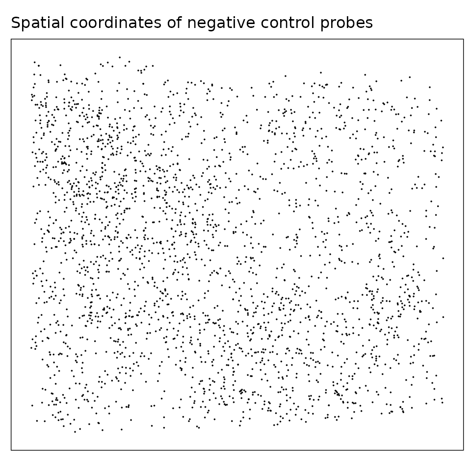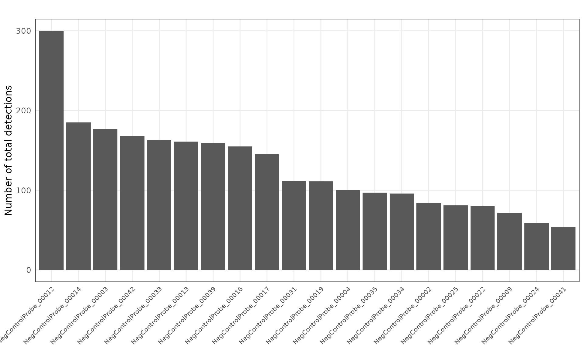 Negative control probes are non-targeting probes designed not to hybridize to any transcript. There are 20 negative control probe targets in this dataset, and the median total detections per target is about 111. There are no particular localised spatial patterns for these probes.