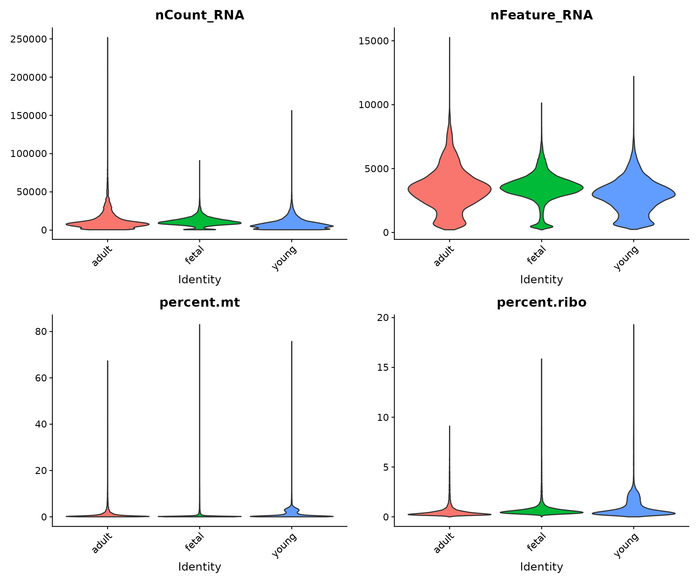 - Calculated QC metrics: library size, genes detected, mitochondrial content, and ribosomal content