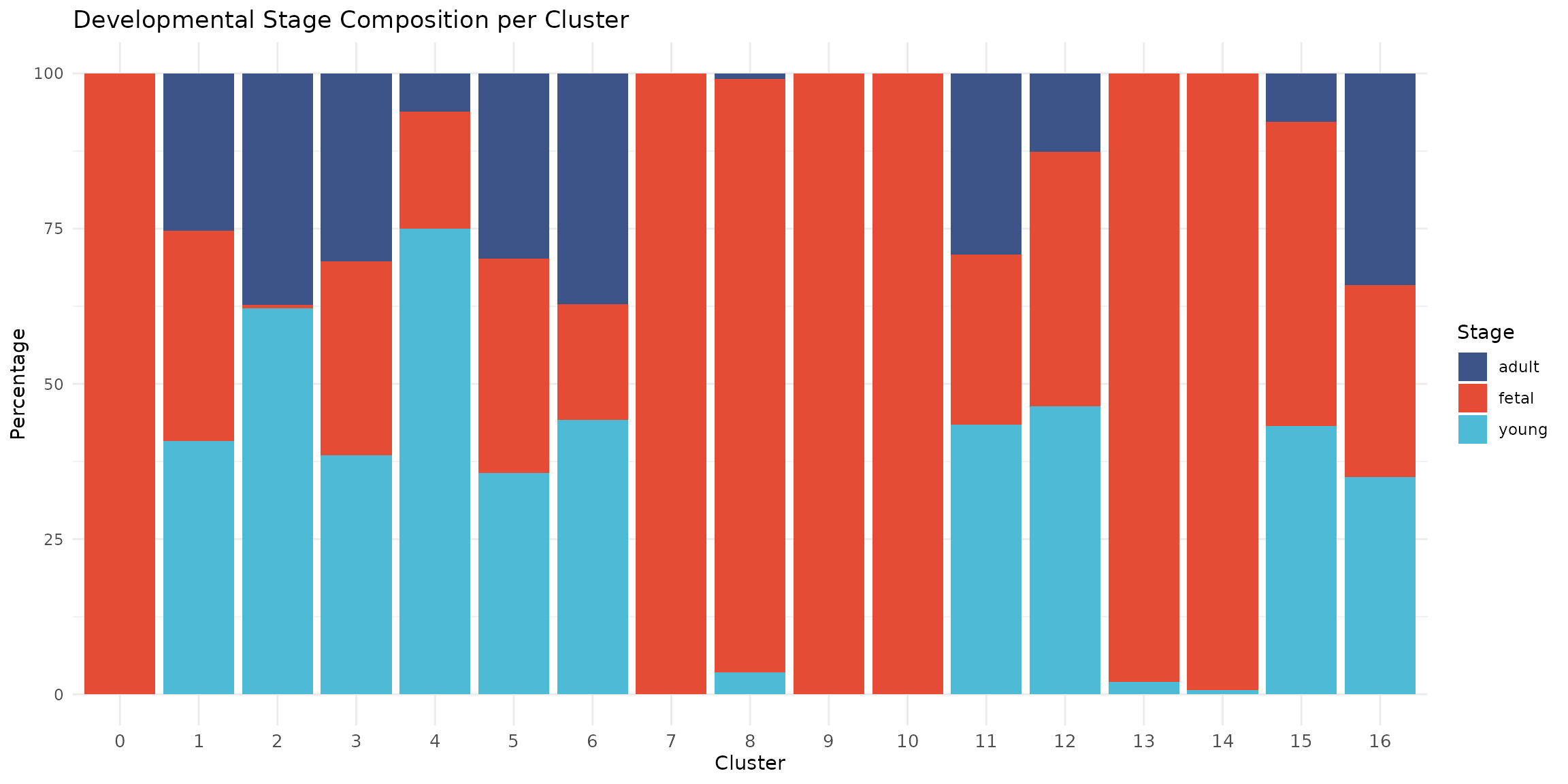 We observe that some clusters are highly enriched for specific developmental stages. For example, clusters 0, 7, 9, 10, 13, and 14 are nearly exclusively fetal (>95%), while cluster 2 contains predominantly young and adult cells. Cluster 8 (proliferating cells) is 96% fetal, consistent with the high proliferative capacity of fetal cardiac cells. This developmental segregation reflects biological differences in cell state, particularly among cardiomyocytes where fetal cells have distinct transcriptional profiles from mature cells.