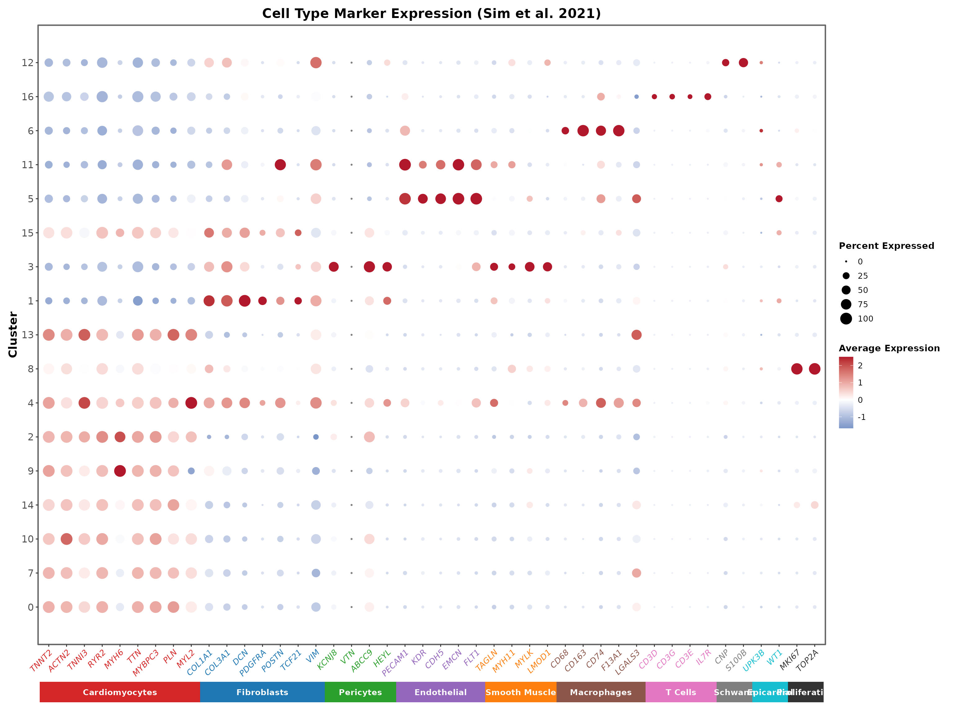 FindAllMarkers() - Compared cluster markers against known heart cell type markers from Sim et al. 2021
