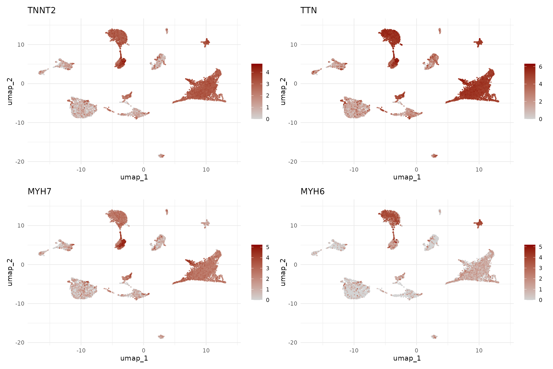 - Cardiomyocytes: The contractile muscle cells, marked by TNNT2, TTN, MYH7