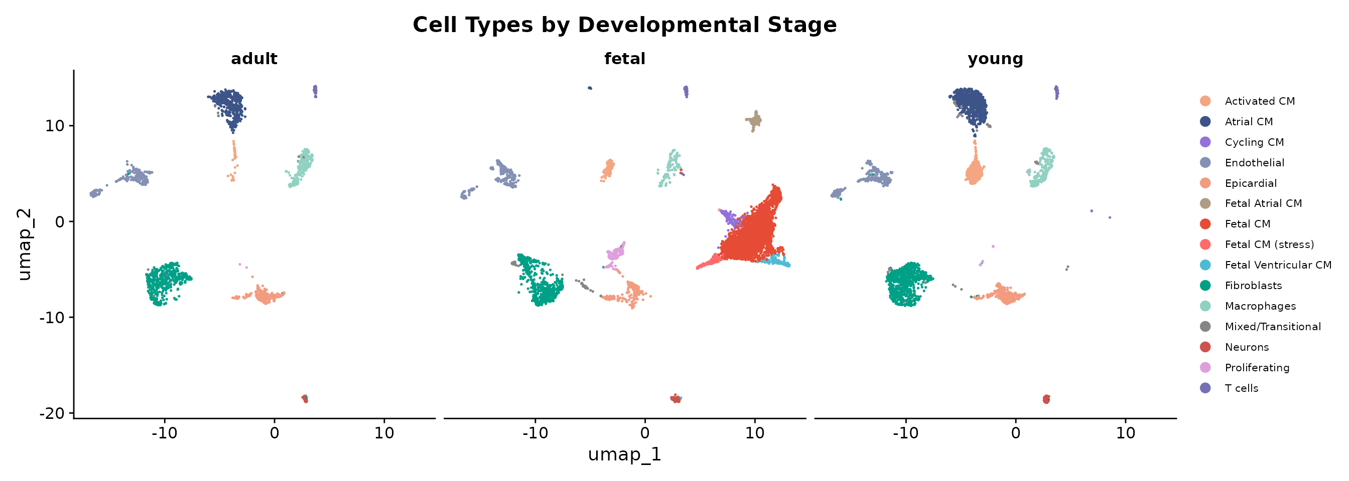 Finally, we split the UMAP by developmental stage to directly visualise which cell types are present at each time point. This view clearly shows how the cellular landscape changes from fetal to adult heart.