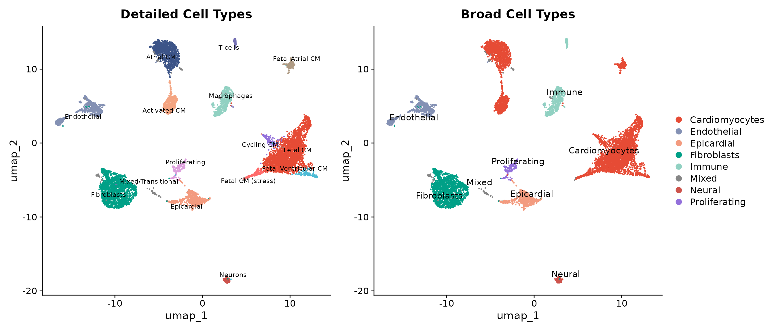 - Created both detailed (13 types) and broad (8 types) cell type annotations